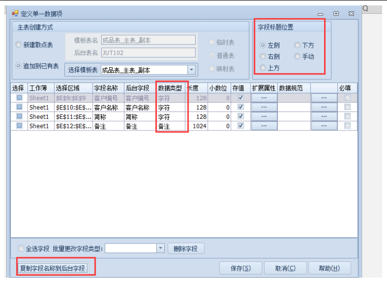 【字段标题位置】用于指定标题的位置,我们上图标题在左侧,所以选择左侧;【数据类型】用于指定字段存到数据库的类型,包含字符、整数、小数、附件等多种数据类型;【复制字段名称到后台字段】用于将【字段名称】和【后台字段】保持一致,即数据库中的字段名称。
