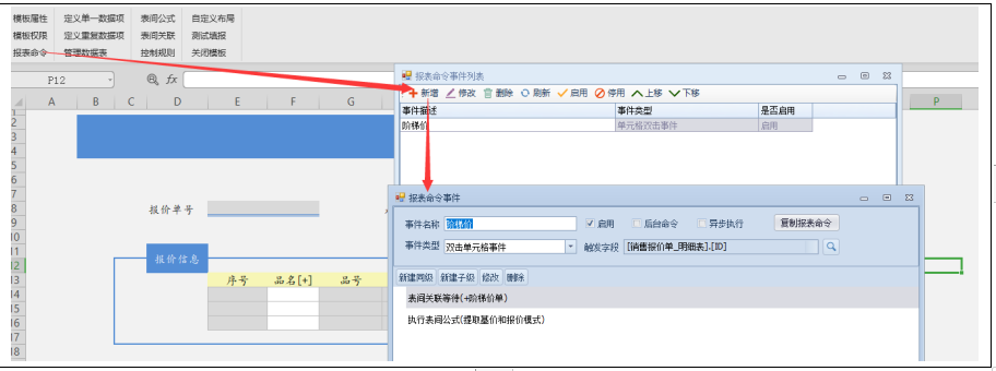 我们前两步一个是表间关联,一个是表间公式,我们需要使用双击ID来进行触发,所以需要报表命令。该报表命令为双击单元格事件,触发字段为报价单明细表中的ID,执行的命令为表间关联等待第一步的表间关联,执行表间公式第二步的表间公式