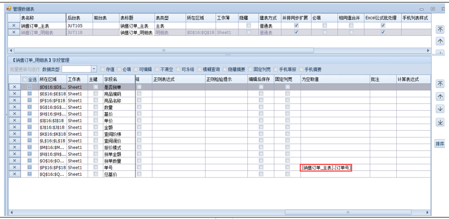 主表定义单一数据项之后,打开【管理数据表】、【报价单号】字段绑定了一个自动编号、【是否拼单】字段绑定了数据规范单选框