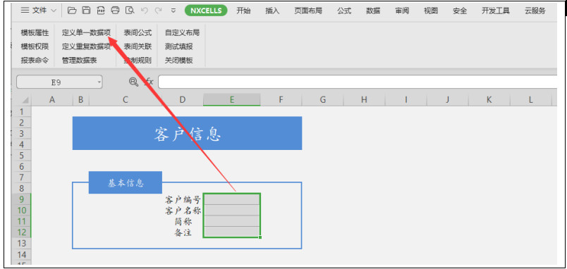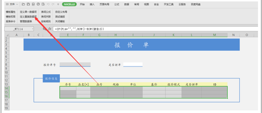 接下来要定义字段,都是主表内容,所以要【定义单一数据项】,选中字段区域,点击工具栏中的定义单一数据项