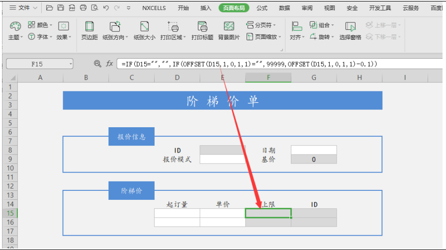 为了方便用户,我们应当在输入下限的时候,自动出现上限,这里需要使用excel偏移函数offset,当下一明细行没有起订量时,默认上限为99999,否则为下一明细行的起订量减去0.1得到上限。