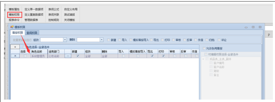 点击【模板权限】—【填报权限】,选择一个角色,给定该角色的新建、修改、删除、导出、打印、审核、反审、作废等权限。
