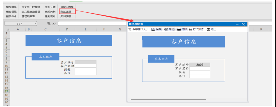 点击【测试填报】可以查看一下我们的报表;【保存窗口大小】可以通过拖拽这个窗口得到我们需要的窗口大小,以后每次新增、修改、查看都是这个窗口大小。