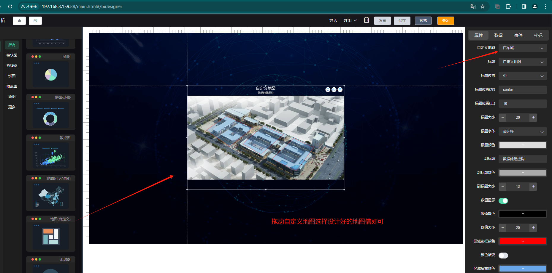 注意:自定义地图宽度和高度 默认不用设置,会自适应组件宽高,想要预览时放大滚动 才需要设置