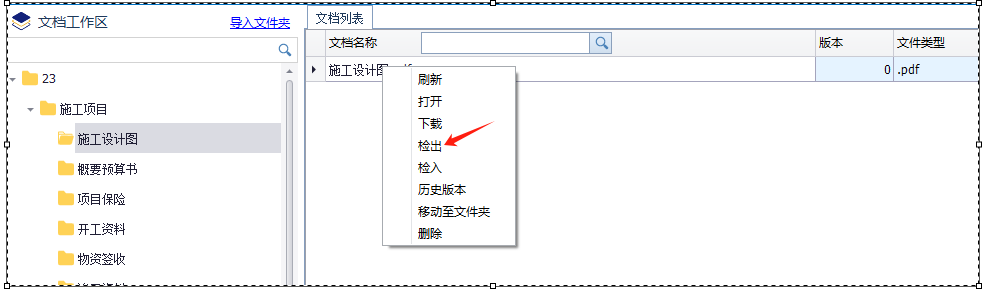 (2) 在文档工作区操作实现(选择需检出的文件,右击检出)