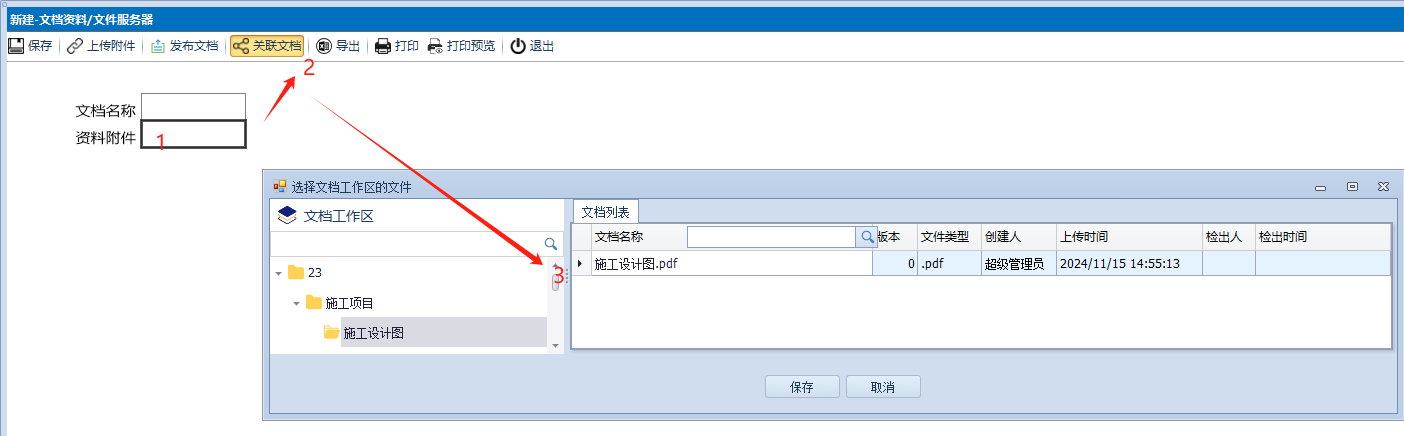 (2)选择附件字段–点击关联文档—选择文档–保存