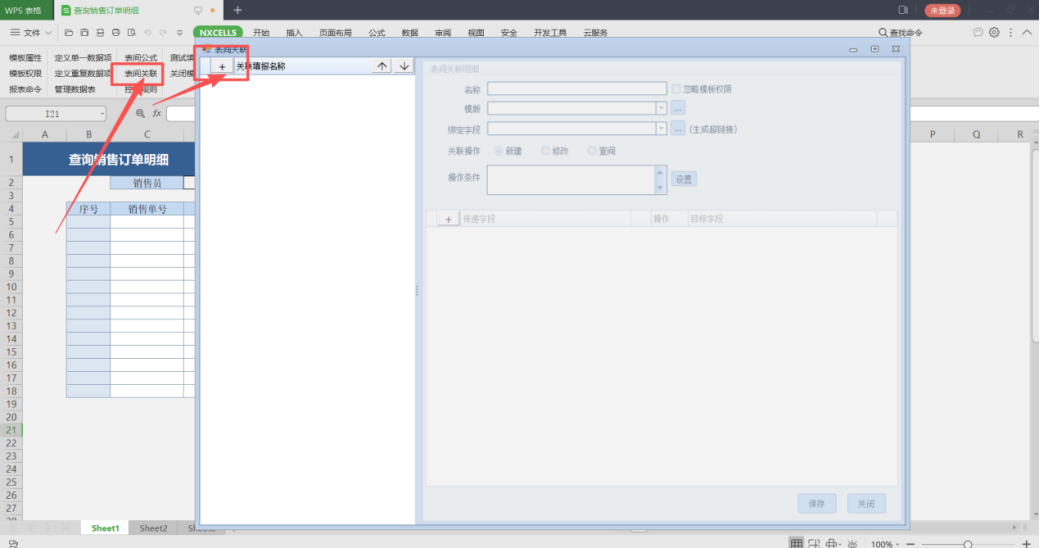 2.我们点击表间关联,点击加号按钮新增关联,填写表间关联名称,选择要关联的表单,选则绑定字段(会生成一个超链接),关联操作选择查阅,传递字段,我们使用明细表新增的销售单号字段去匹配销售订单的销售单号