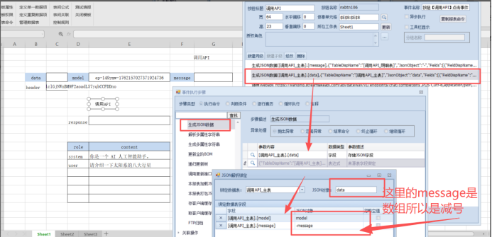 上一页 先将明细表打包到message字段,如下图:将主表字段model、message打包到data字段,如下图:如果在对象名之前输入”-“即代表对数组进行打包,如果在对象名之前输入”+”即代表对对象进行打包。 使用表命令(调用webapi)将数据返回到response字段。如下图:效果图: 下一页作者:test 创建时间:2025-11-04 13:40最后编辑:test 更新时间:2025-11-04 13:43
