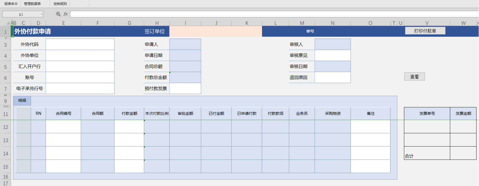 创建打印模板样式以及用于获取数据的明细辅助表(将所需要的数据获取到辅助明细后,根据报表命令逐行遍历将数据依次赋值到打印样式的模板中,并利用报表命令区域复制粘贴功能实现多条数据生成多个打印样式的单据)