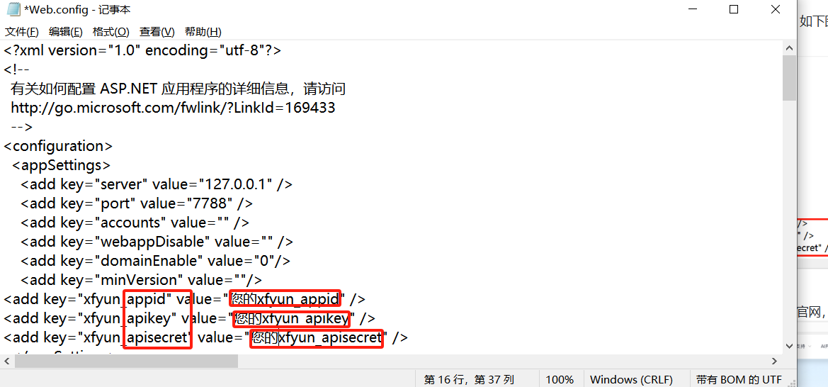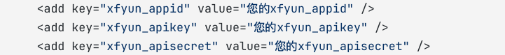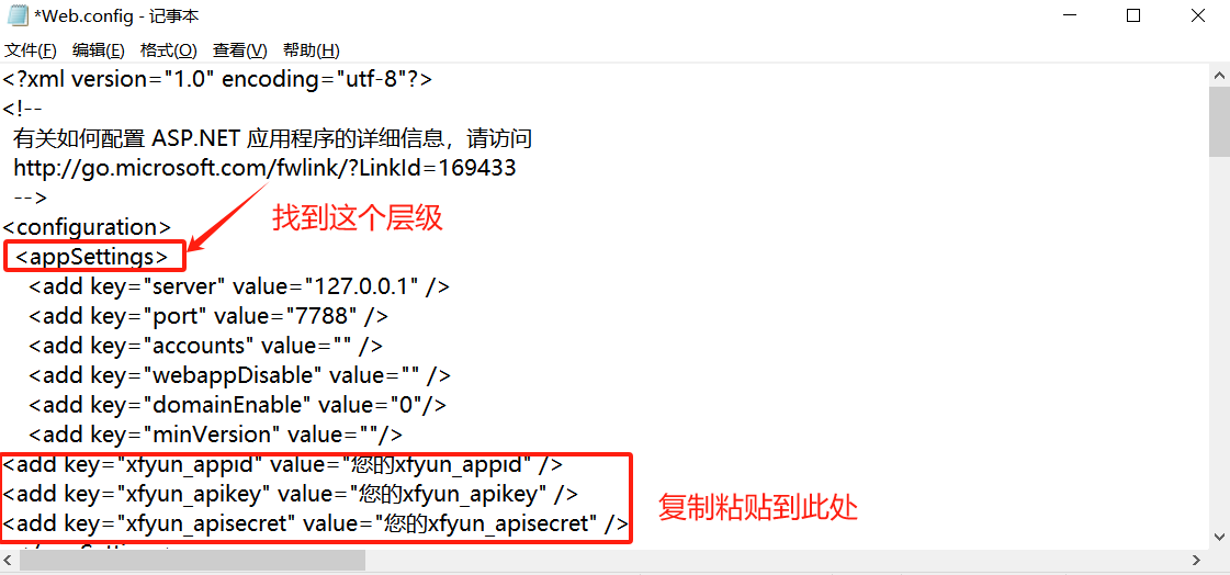 复制三串密钥分别对应替换web.config中先前复制添加进去的双引号中内容