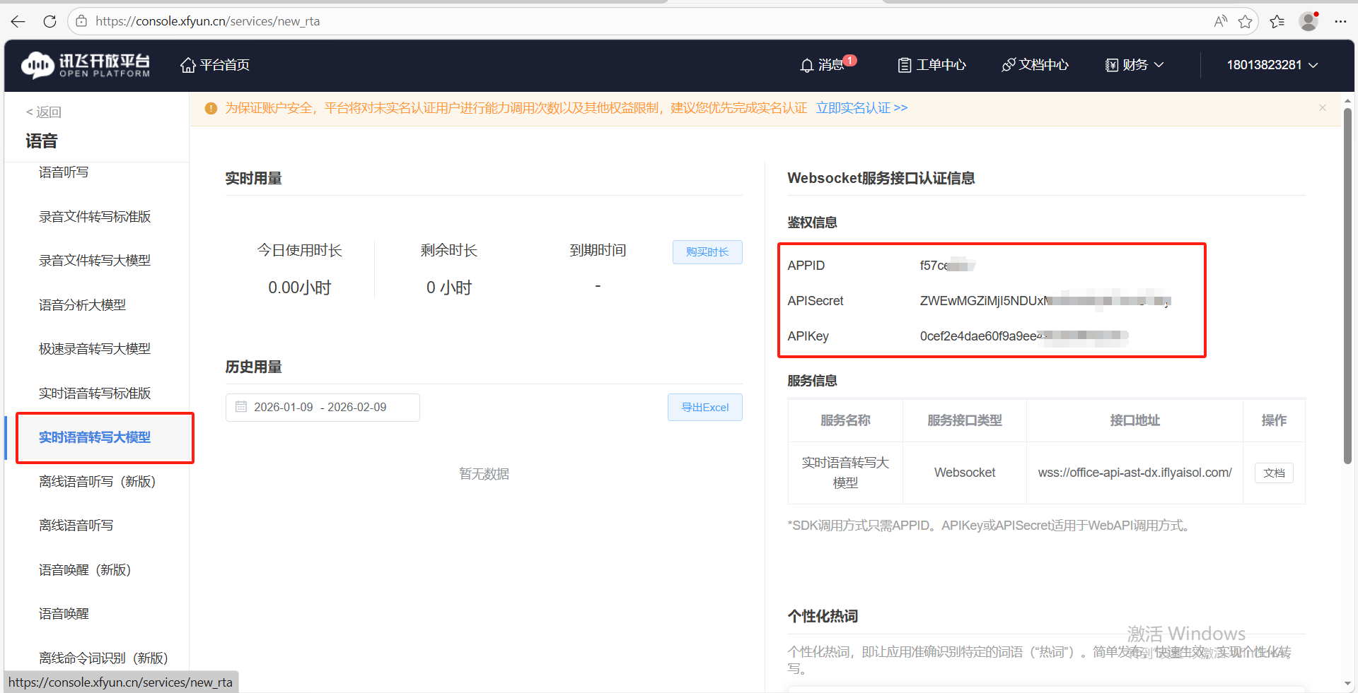 在左侧的语音识别分类下找到实时语音转写大模型及右侧的ID、Secret、Key